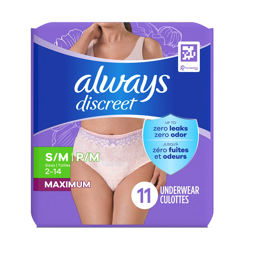 Enfin! Une protection longue durée contre les fuites urinaires qui est aussi confortable qu’elle en a l’air. Faites vos adieux aux couches pour adultes volumineuses et dites bonjour aux culottes d’incontinence jetables Always Discreet pour femmes offertes avec un ajustement sûr et confortable, pour la sensation et l’apparence d’une vraie culotte. La conception ajustée des culottes d’incontinence et de post-partum pour femmes Always Discreet épouse vos courbes grâce à un tissu doux et soyeux pour que vous puissiez marcher avec élégance et confiance. L’aspect délicat et à peine perceptible que vous désirez obtenir d’une culotte jetable pour femmes, combiné à la protection sans fuites que vous méritez. Le centre super absorbant transforme le liquide en gel pour emprisonner les fuites urinaires en quelques secondes et offrir une protection sans fuites de confiance jusqu’à 12 heures. La technologie exclusive OdorLock neutralise instantanément et de façon continue les odeurs pour vous aider à vous sentir fraîche, confiante et au sec toute la journée. Les fuites inattendues ne seront plus un problème grâce aux côtés spécialement conçus de la protection latérale LeakGuard spéciale qui contribuent à arrêter les fuites urinaires à l’entrejambe, là où elles surviennent le plus souvent. Obtenez une protection incroyable grâce à la culotte jetable sur laquelle les femmes peuvent compter. Conçues spécialement pour convenir à tous les types de courbes, les culottes d’incontinence Always Discreet sont offertes en tailles petite/moyenne à grande/très grande/TTG, pour que vous puissiez avoir la certitude d’obtenir la protection que vous méritez avec les culottes d’incontinence et de post-partum Always Discreet. Sacs faciles à ouvrir pour plus de commodité. Les culottes d’incontinence pour femmes sont livrées discrètement et sont offertes en vrac.
