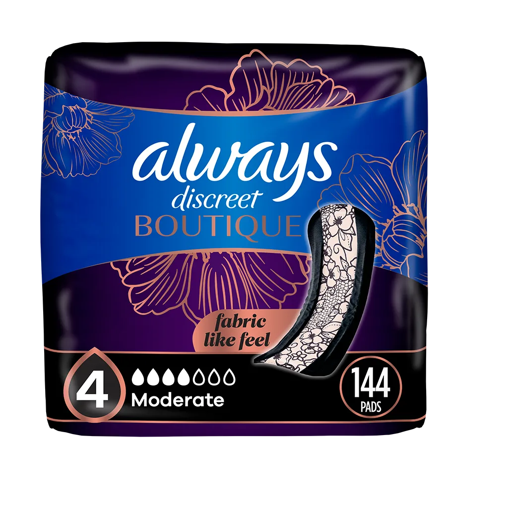 Avec Always Discreet Boutique, les fuites urinaires ne vous empêchent pas de vous sentir mieux. Découvrez une incroyable protection contre les fuites urinaires qui ressemble à vos culottes préférées, grâce à son matériau semblable à du tissu. La conception ajustée épouse vos courbes avec un tissu doux et soyeux pour que vous puissiez marcher avec assurance et confiance lorsque vous portez les protège-dessous d’incontinence et post-partum Always Discreet Boutique. C’est le look délicat et à peine perceptible que vous voulez, associé à la protection antifuite que vous méritez. Un noyau caché transforme le liquide en gel et emprisonne l’humidité, pour que vous vous sentiez frais et en sécurité pendant des heures. La technologie OdorLock, légèrement parfumée, neutralise les odeurs instantanément et en continu pour que vous restiez fraîche toute la journée. Always Discreet Boutique vous permet de marcher avec assurance et évite les fuites urinaires. Ne laissez pas les fuites gêner votre journée, trouvez simplement votre bonne taille avec le tableau Always Discreet My Fit et obtenez la protection sur laquelle vous pouvez compter. Vous serez sûre d’obtenir la protection que vous méritez avec les serviettes d’incontinence Always Discreet Boutique pour femmes.