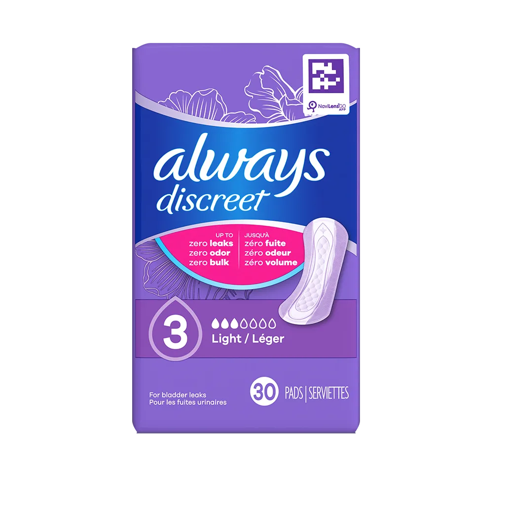 Les serviettes Always Discreet ont un parfum léger et frais et ont été testées dermatologiquement. Elles utilisent la technologie exclusive OdorLock pour neutraliser les odeurs d’urine instantanément et en continu plutôt que de simplement couvrir les odeurs.
