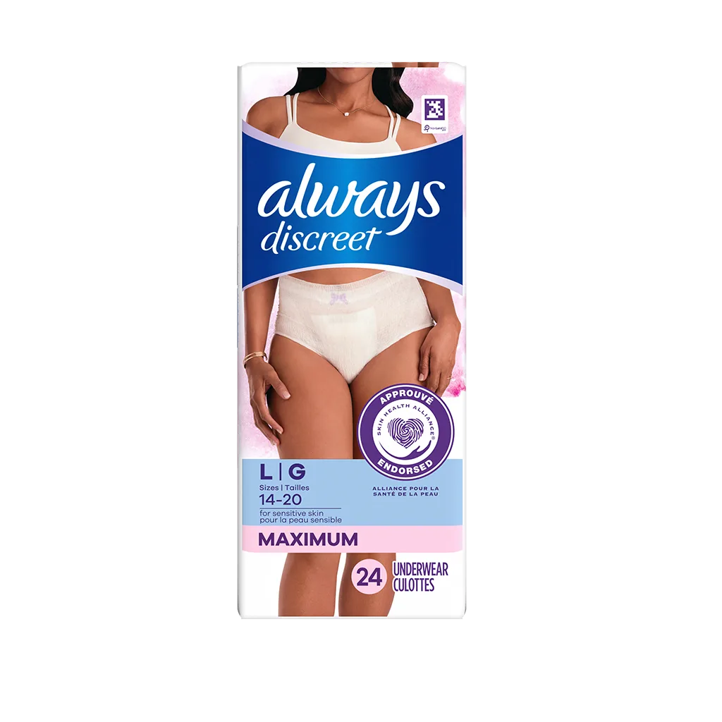 Les culottes Always Discreet Underwear sont disponibles dans des tailles allant du petit au très grand. Always Discreet propose également des protège-dessous et des serviettes dans toute une gamme de degrés d’absorption pour répondre à vos besoins en matière de fuites urinaires. Consultez notre tableau des tailles pour trouver le produit qui vous convient.
