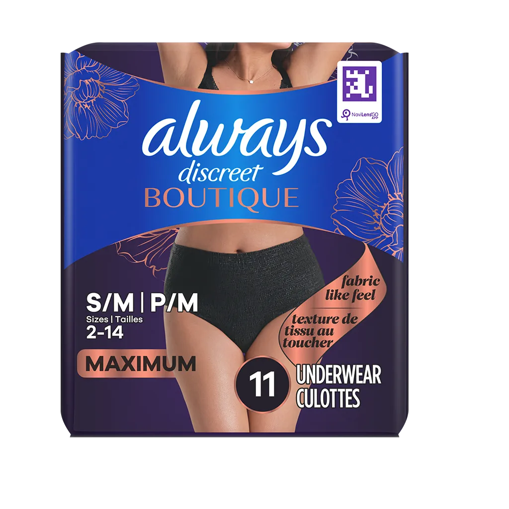 Vous recherchez des culottes d’incontinence jetables pour femmes qui vous offrent une protection maximale? Vous en avez assez des couches pour adultes encombrantes qui n’ont ni l’apparence ni la sensation d’une « vraie » culotte? Essayez les culottes d’incontinence Always Discreet Boutique, qui offrent notre coupe la plus sophistiquée ainsi qu’une sensation de douceur que vous adorerez. Le design ajusté épouse les courbes de la femme avec un tissu doux, semblable à de la soie, pour que vous puissiez marcher avec élégance et assurance. Le centre ultra-mince transforme le liquide en gel et bloque l’humidité en quelques secondes pour une protection maximale qui vous procure une sensation de sécurité pendant des heures. De plus, ces culottes sont dotées d’une protection latérale LeakGuard spéciale pour aider à arrêter les fuites là où elles se produisent le plus : au niveau de la jambe. Que vous ayez une vessie hyperactive ou que vous ayez des fuites urinaires post-partum, la technologie exclusive OdorLock neutralise les odeurs instantanément et de façon continue pour vous permettre de rester fraîche toute la journée. Obtenez une protection incroyable et fiable avec les culottes d’incontinence jetables Always Discreet pour femmes, offertes en tailles P/M à TG pour s’adapter à toutes sortes de courbes. Ne laissez pas les fuites entraver votre journée, trouvez simplement la bonne taille grâce au tableau My Fit Always Discreet et obtenez la protection sur laquelle vous pouvez compter. Ensuite, choisissez entre deux options différentes, mais tout aussi élégantes : la culotte noire ou la culotte couleur rosée, pour mieux personnaliser votre apparence.